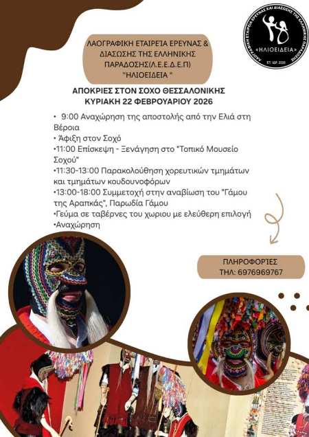 Η Λαογραφική Εταιρεία Έρευνας και Διάσωσης της Ελληνικής Παράδοσης “ΗΛΙΟΕΙΔΕΙΑ” την Κυριακή 22/02/2026 θα πραγματοποιήσει ημερήσια εκδρομή για τα μέλη και του φίλους της στον Σοχό Θεσσαλονίκης, στα πλαίσια της Αποκριάς.