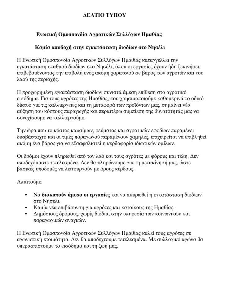 Καταθέτουμε ΑΝΑΦΟΡΑ το Δελτίο Τύπου της Ενωτικής Ομοσπονδίας Αγροτικών Συλλόγων Ημαθίας, στο οποίο ζητούν μεταξύ άλλων να ακυρωθεί η εγκατάσταση διοδίων στο Νησέλι και και αναλύουν τους λόγους.