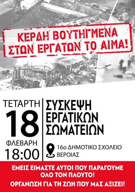 Γιατί για να υπερασπιστούμε τη ζωή τη δική μας και των παιδιών μας απαιτείται σύγκρουση, συλλογικός, οργανωμένος, διεκδικητικός αγώνας που να στρέφεται απέναντι στον πραγματικό ένοχο, την εγκληματική πολιτική του κέρδους και όσους την υπηρετούν. Μέσα από την οργάνωσή μας στα συνδικάτα και τα σωματεία, με κατεύθυνση σύγκρουσης με τη μεγαλοεργοδοσία και το κράτος της, μπορεί να ανοίξει ο μόνος ελπιδοφόρος δρόμος για την ικανοποίηση των σύγχρονων αναγκών μας.