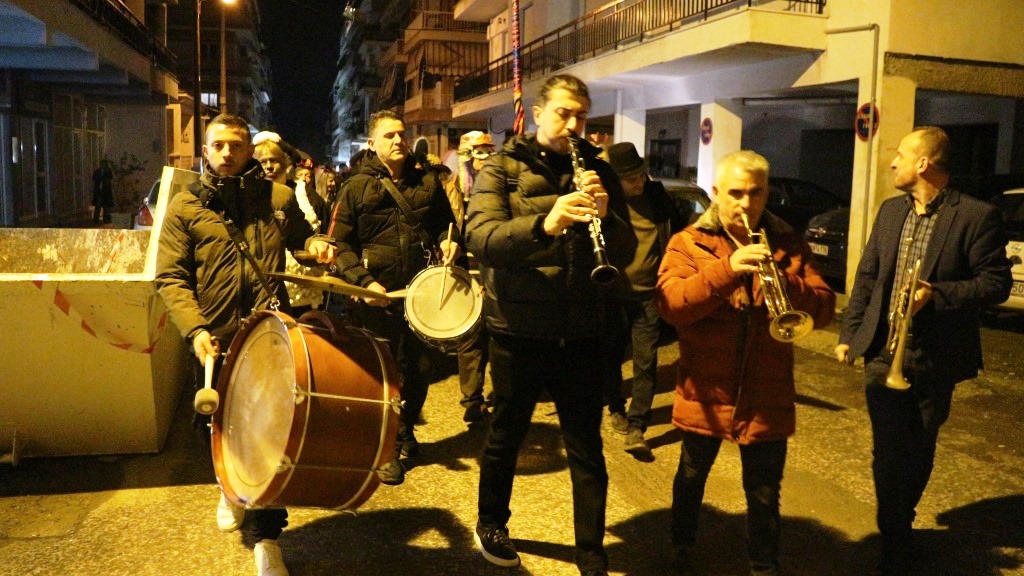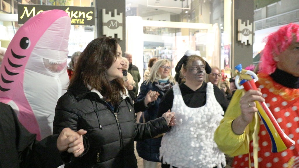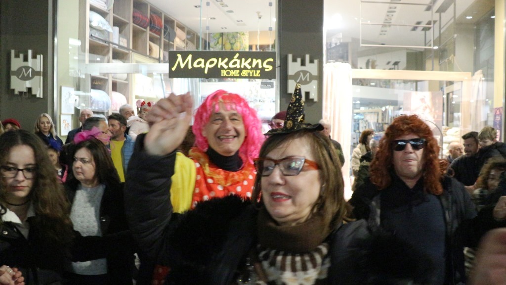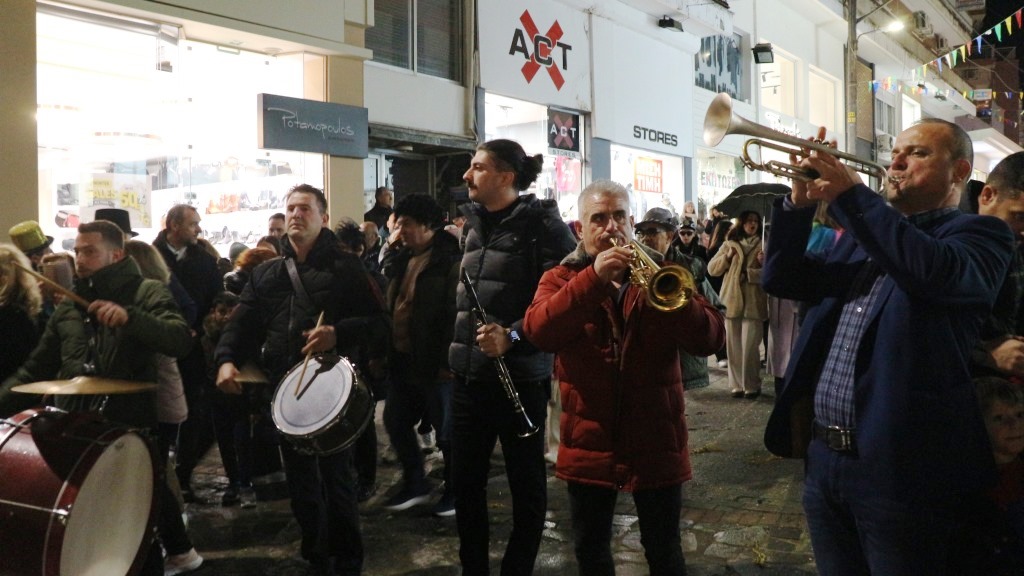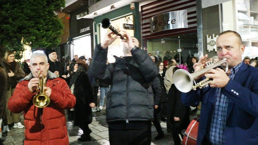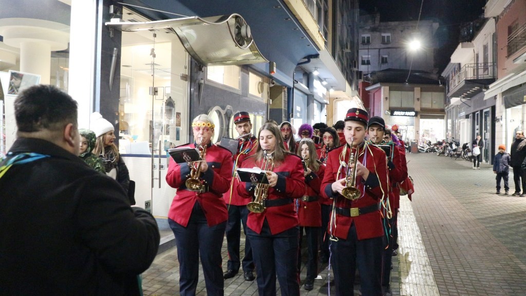 Οι χορευτές του Τμήματος Λαογραφίας ξεκίνησαν την πατινάδα τους από τη Αντωνιάδεια Στέγη Γραμμάτων και Τεχνών με συνοδεία χάλκινων πνευστών, διασχίζοντας το κέντρο της πόλης, για να συναντηθούν με τον κόσμο που τους περίμενε στο Εμπορικό Κέντρο στις 7.30 το βράδυ. Κι αυτό κόντρα στο ψιλόβροχο, που έπεφτε και που σίγουρα δεν ήταν καλός οιωνός για τη συνέχεια.
