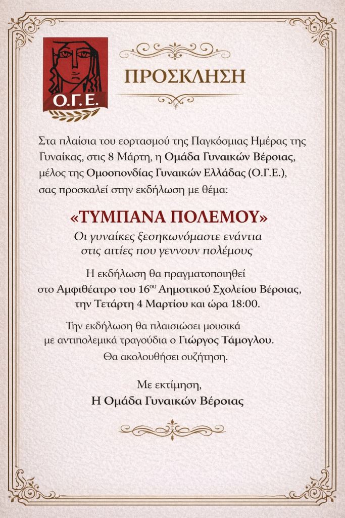 Στα πλαίσια του εορτασμού της Παγκόσμιας Ημέρας της Γυναίκας, στις 8 του Μάρτη, η Ομάδα Γυναικών Βέροιας σας προσκαλεί σε εκδήλωση με θέμα: “Τύμπανα πολέμου”
