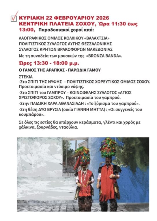 Βέροια Εκδηλώσεις Βέροια – Ηλιοείδεια: Εκδρομή στο Σοχό – το πρόγραμμα / Κυριακή 22 Φεβρουαρίου Faretra.info 18/02/2026, 21:57 Share on Facebook Share on Twitter Send with mail Ηλιοείδεια: Εκδρομή στο Σοχό – το πρόγραμμα / Κυριακή 22 Φεβρουαρίου – Φαρέτρα Ηλιοείδεια Σοχός ΣΧΕΤΙΚΑ ΑΡΘΡΑ Πολιτισμός Βέροια – Ηλιοείδεια: 8ο Σεμινάριο Παραδοσιακών Χορών / Κυριακή 8 Μαρτίου Βέροια Βέροια – “Ηλιοείδεια”: Ημερήσια εκδρομή στον Σοχό / Κυριακή 22 Φεβρουαρίου Αθλητικά Βέροια: Στις 13 & 14 Δεκεμβρίου ο 12ος Φιλίππειος δρόμος Θεάματα Βέροια: Η οπερέτα του Θ. Σακελλαρίδη «Θέλω να δω τον Πάπα» από την Εθνική Λυρική Σκηνή, στο Χώρο Τεχνών / Τρίτη 25 Νοεμβρίου Θέατρο Η «Πετριχώρα» σε σκηνοθεσία Χάρη Θώμου, στην Αντωνιάδειο Στέγη από την DOT Ensemble / Σάββατο 29 Νοεμβρίου Βέροια Βέροια: Δευτέρα 1η Δεκεμβρίου το άναμμα του Δέντρου στην πλατεία Εληάς
