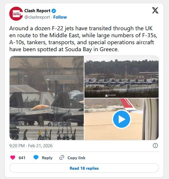 Πάντως, σύμφωνα με πληροφορίες που δημοσίευσε το Σάββατο (21/2) ο λογαριασμός Clash Report στο Χ, περίπου 12 υπερσύγχρονα αεροσκάφη F-22 διήλθαν από το Ηνωμένο Βασίλειο με προορισμό την ευρύτερη περιοχή.