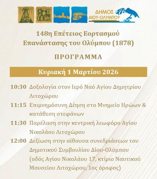 Το πρόγραμμα εορτασμού της 148ης επετείου της Επανάστασης του Ολύμπου (1878) / Λιτόχωρο, 28 Φεβρουαρίου & 1 Μαρτίου