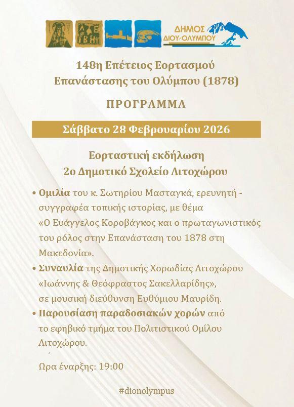 Το πρόγραμμα εορτασμού της 148ης επετείου της Επανάστασης του Ολύμπου (1878) / Λιτόχωρο, 28 Φεβρουαρίου & 1 Μαρτίου