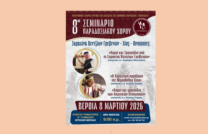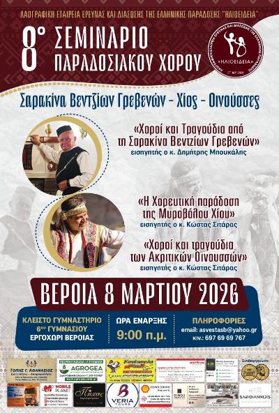 Την Κυριακή 8 Μαρτίου 2026 η Λ.Ε.Ε.Δ.Ε.Π. “ΗΛΙΟΕΙΔΕΙΑ” πραγματοποιεί σε συνδιοργάνωση με τον Δήμο Βέροιας, το 8ο Πανελλήνιο Σεμινάριο Παραδοσιακών Χορών στο κλειστό γυμναστήριο του 6ου Γυμνασίου Βέροιας, με συμμετοχή χοροδιδασκάλων και χορευτών από διάφορα μέρη της Ελλάδας.