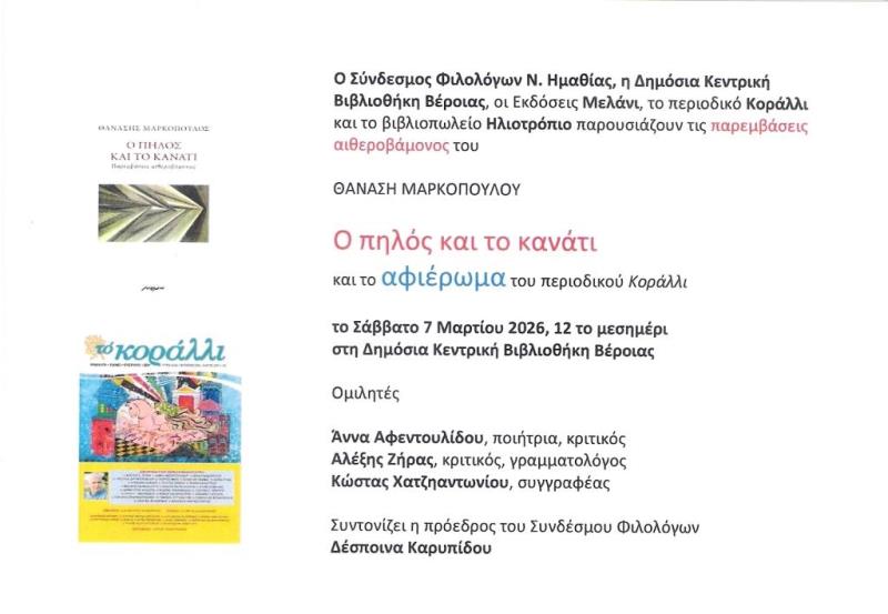 Ο Σύνδεσμος Φιλολόγων Ν. Ημαθίας, η Δημόσια Κεντρική Βιβλιοθήκη Βέροιας, οι Εκδόσεις Μελάνι, το περιοδικό Κοράλλι και το βιβλιοπωλείο Ηλιοτρόπιο παρουσιάζουν τις παρεμβάσεις αιθεροβάμονος του Θανάση Μαρκόπουλου