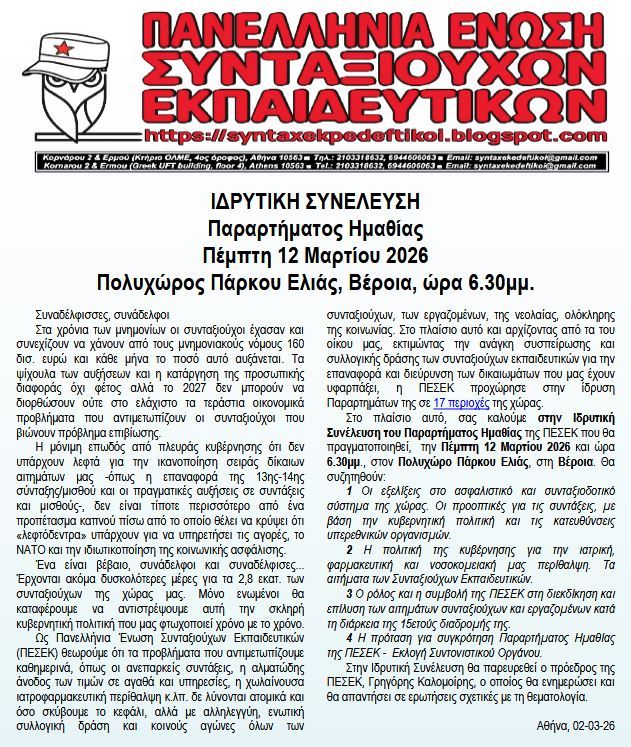 Βέροια Εκδηλώσεις Τοπικά Ημαθία: Ιδρυτική συνέλευση παραρτήματος Πανελλήνιας Ένωσης Συνταξιούχων Εκπαιδευτικών / Βέροια, Πέμπτη 12 Μαρτίου Faretra.info 03/03/2026, 23:36 Share on Facebook Share on Twitter Send with mail – Φαρέτρα ΣΧΕΤΙΚΑ ΑΡΘΡΑ Δεν υπάρχουν σχετικά άρθρα.