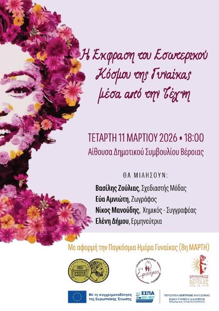 Ο Δήμος Βέροιας, ο Σύλλογος Κοινωνικής Παρέμβασης «Έρασμος» και ο Εμπορικός Σύλλογος Βέροιας συνδιοργανώνουν εκδήλωση με θέμα: «Η Έκφραση του Εσωτερικού Κόσμου της Γυναίκας μέσα από την Τέχνη» (Γράμματα, Μόδα, Μουσική), το απόγευμα της Τετάρτης 11 Μαρτίου 2026, στις 18.00, στην Αίθουσα του Δημοτικού Συμβουλίου.