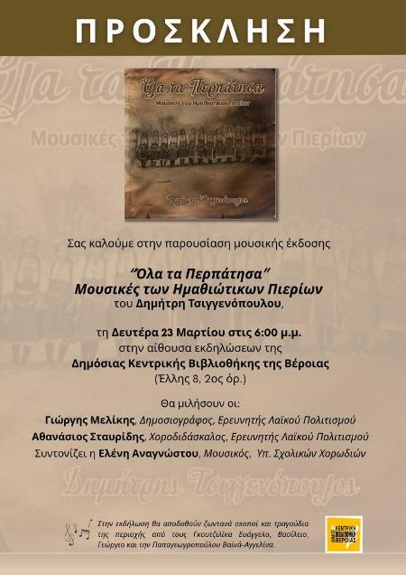 Παρουσίαση της μουσικής έκδοσης «Μουσικές των Ημαθιώτικων Πιερίων» του Δημήτρη Τσιγγενόπουλου / Δημόσιας Βιβλιοθήκης Βέροιας, Δευτέρα 23 Μαρτίου