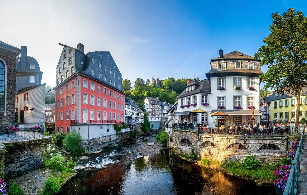 Κρυμμένο βαθιά στην καταπράσινη κοιλάδα της περιοχής Άιφελ, λίγα μόλις χιλιόμετρα από τα σύνορα με το Βέλγιο, το Monschau μοιάζει με τόπο όπου ο χρόνος έχει επιβραδύνει, αν όχι σταματήσει εντελώς. Μικρό, σχεδόν θεατρικό σε κλίμακα, το ιστορικό του κέντρο απλώνεται κατά μήκος του ποταμού Rur River, που διασχίζει την πόλη και αντανακλά στα νερά του μια από τις πιο γοητευτικές εικόνες της γερμανικής επαρχίας.