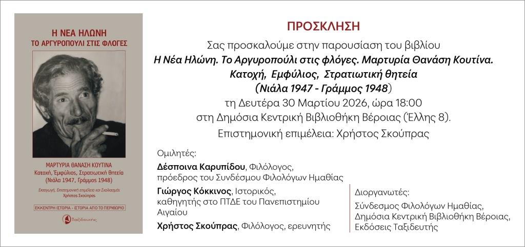 Παρουσίαση βιβλίου: “Η Νέα Ηλώνη. Το Αργυροπούλι στις φλόγες. Μαρτυρία του Θανάση Κουτίνα” / Δευτέρα 30 Μαρτίου