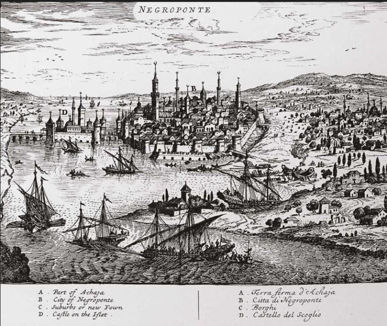 Εις την πόλιν της Ευβοίας, μόλις ευρίσκονται50 ή 50 οικογένειαι Χριστιανικαί, ασήμαντοι και σχεδόν όλαι ακτήμονες. Η ηθική τους κατάστασις, ολίγον διαφέρει από εκείνην των Τούρκων, με τους οποίους συνανετράφησαν και είναι σχεδόν όλοι αγράμματοι.