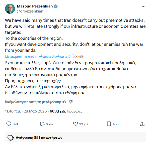 Σε ανάρτησή του στην πλατφόρμα X, ο Ιρανός πρόεδρος υπογράμμισε ότι η Τεχεράνη δεν προχωρά σε προληπτικές επιθέσεις, αλλά θα απαντήσει δυναμικά εάν πληγούν οι υποδομές ή τα οικονομικά της κέντρα.
