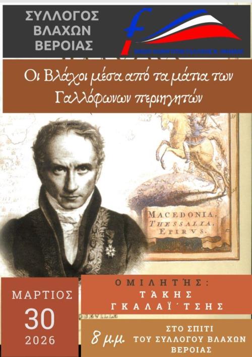 Βέροια – εκδήλωση: “Οι Βλάχοι μέσα από τα μάτια των Γαλλόφωνων περιηγητών” / Δευτέρα 30 Μαρτίου