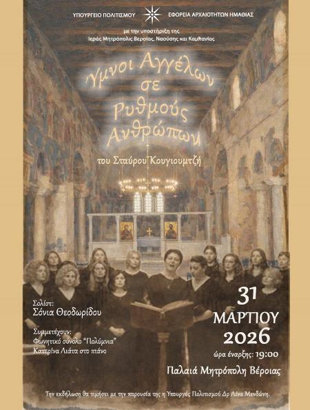 Το Υπουργείο Πολιτισμού και η Εφορεία Αρχαιοτήτων Ημαθίας, με την υποστήριξη της Ιεράς Μητροπόλεως Βεροίας, Ναούσης και Καμπανίας, σας προσκαλούν στην παρουσίαση του έργου «Ύμνοι Αγγέλων σε Ρυθμούς Ανθρώπων» του συνθέτη Σταύρου Κουγιουμτζή, με σολίστ τη σοπράνο Σόνια Θεοδωρίδου, που θα πραγματοποιηθεί την Τρίτη 31 Μαρτίου 2026, στην Παλαιά Μητρόπολη Βέροιας, ώρα 19:00.