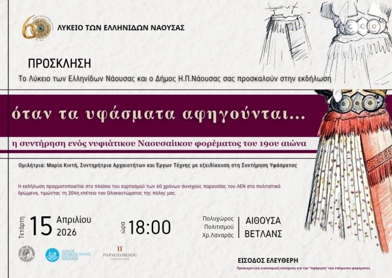 Εκδήλωση Λυκείου Ελληνίδων Νάουσας: «Όταν τα υφάσματα αφηγούνται» / Τετάρτη 15 Απριλίου