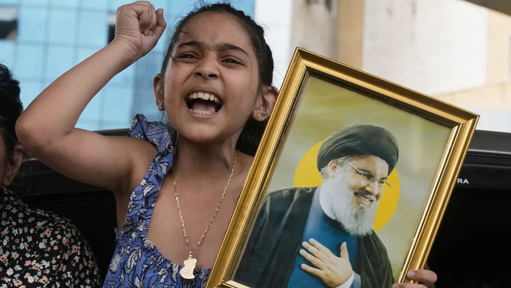 Εκτοπισμένοι κάτοικοι του νότιου Λιβάνου επιστρέφουν στα βομβαρδισμένα χωριά τους ανεμίζοντας σημαίες του Λιβάνου και της Χεζμπολάχ, όπου κυριαρχεί το πορτρέτο του ηγέτη της Ναΐμ Κάσεμ | AP Photo/Hassan Ammar