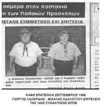 Ως επίλογο δημοσιεύω μια φωτογραφία που έβγαλα σε δύο αγαπημένους φίλους μου και συνεργάτες προσκόπους, τον αείμνηστο κουμπάρο μου Μιχάλη Αδαλόγλου και τον Γιώργο Λαζαρίδη, λίγο πριν αρχίσει να λειτουργεί το “Ερατεινόν” του Νίκου Καλαιτζή, όπου είχαμε εγκαταστήσει το στρατηγείο της συνάντησης παλαιών προσκόπων Σεπτέμβριος 1998.