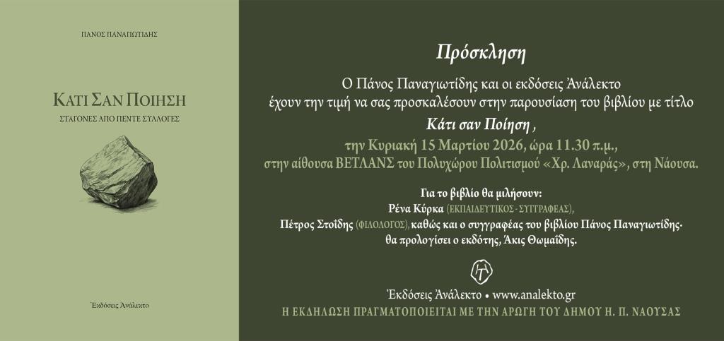 ΠΑΡΟΥΣΙΑΖΕΤΑΙ ΣΤΗ ΝΑΟΥΣΑ ΤΟ ΒΙΒΛΙΟ ΤΟΥ ΠΑΝΟΥ ΠΑΝΑΓΙΩΤΙΔΗ ΚΑΤΙ ΣΑΝ ΠΟΙΗΣΗ Την Κυριακή 15 Μαρτίου 2026, ώρα 11.30 π.μ., στην […]
