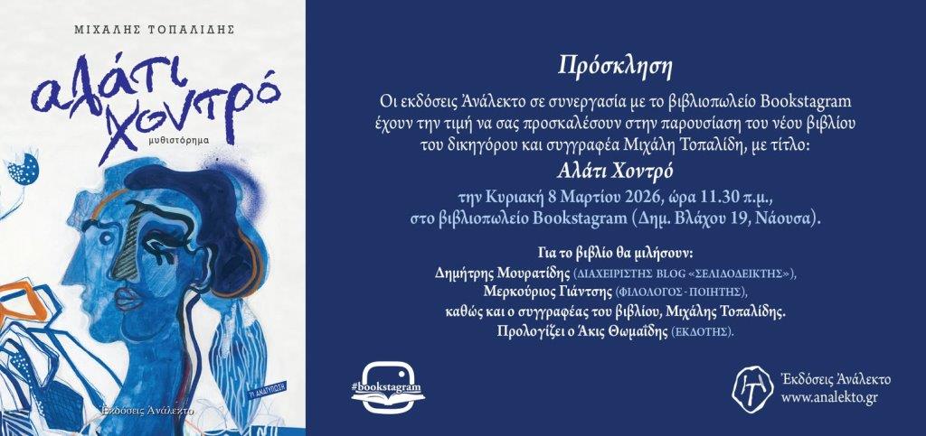 Παρουσίαση βιβλίου: Μιχάλης Τοπαλίδης “Αλάτι χοντρό” – εκδόσεις Ανάλεκτο / Νάουσα, Κυριακή 8 Μαρτίου