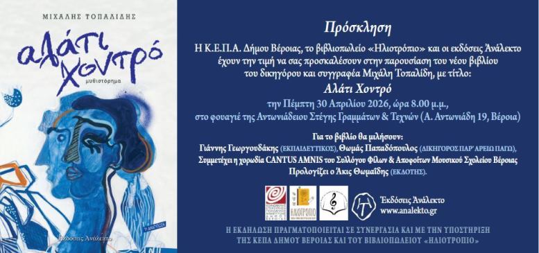 Παρουσίαση βιβλίου: “Μιχάλης Τοπαλίδης «Αλάτι Χοντρό» / Βέροια, Πέμπτη 30 Απριλίου