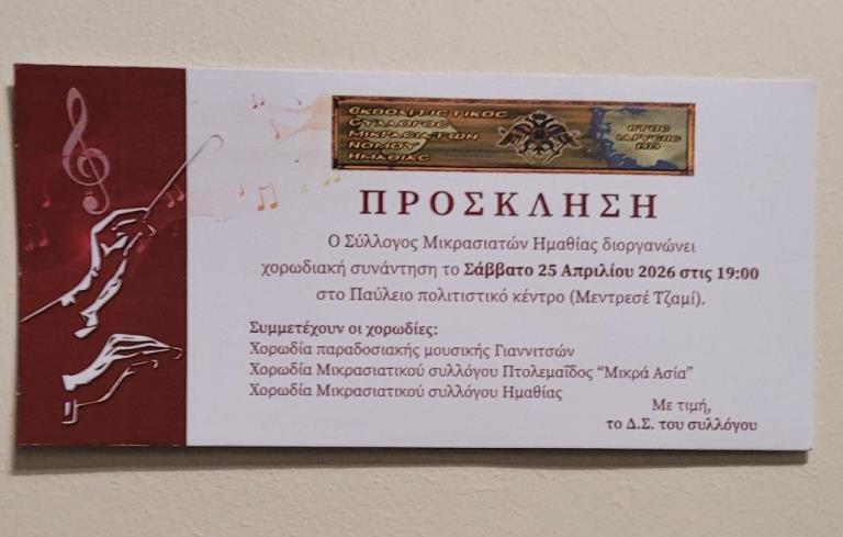 Σύλλογος Μικρασιατών Ημαθίας: “Χορωδιακή συνάντηση” – Τραγούδια απ την καθ’ ημάς Ανατολή / Βέροια, Σάββατο 25 Απριλίου