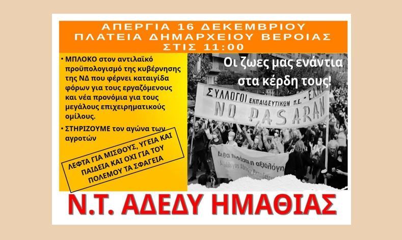 Ν.Τ. ΑΔΕΔΥ Ημαθίας: Απεργιακό κάλεσμα ενάντια στον νέο αντιλαϊκό – φορομπηχτικό προϋπολογισμό της κυβέρνησης / Τρίτη 16 Δεκεμβρίου