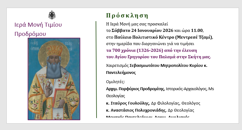 Ιερά Μονή Τιμίου Προδρόμου: Πρόσκληση Ημερίδας Αγίου Γρηγορίου Παλαμά / Βέροια, Σάββατο 24 Ιανουαρίου